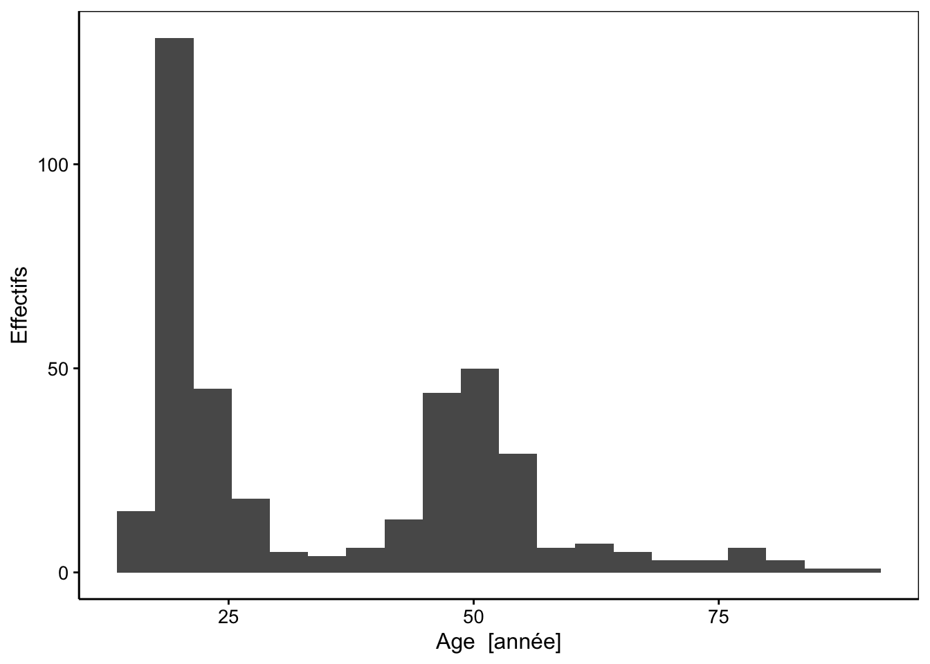 La conversion d’une variable quantitative en une variable qualitative doit souvent passer par une réduction des niveaux en rassemblant les valeurs proches dans des classes. Vous avez déjà utilisé de manière implicite le découpage en classes lorsque vous avez réalisé des histogrammes. Si les histogrammes sont bi- ou multimodaux, un découpage se justifie. Par exemple, le jeu de données portant sur la biométrie humaine est typique d’un cas de distribution bimodale. En fait, ce sont des étudiants (ayant tous une vingtaine d’années) qui ont réalisé ces mesures. La plupart ont choisi de s’inclure dans l’échantillon, d’où un premier mode vers une vingtaine d’années. Ensuite, ils ont pu mesurer d’autres personnes, éventuellement dans leur entourage. Beaucoup ont demandé à leurs parents, ce qui résulte en un second mode vers la cinquantaine22. Donc, la distribution bimodale résulte plus de l’échantillonnage en lui-même que d’une réalité démographique ! Cela ne change cependant rien pour l’exercice.