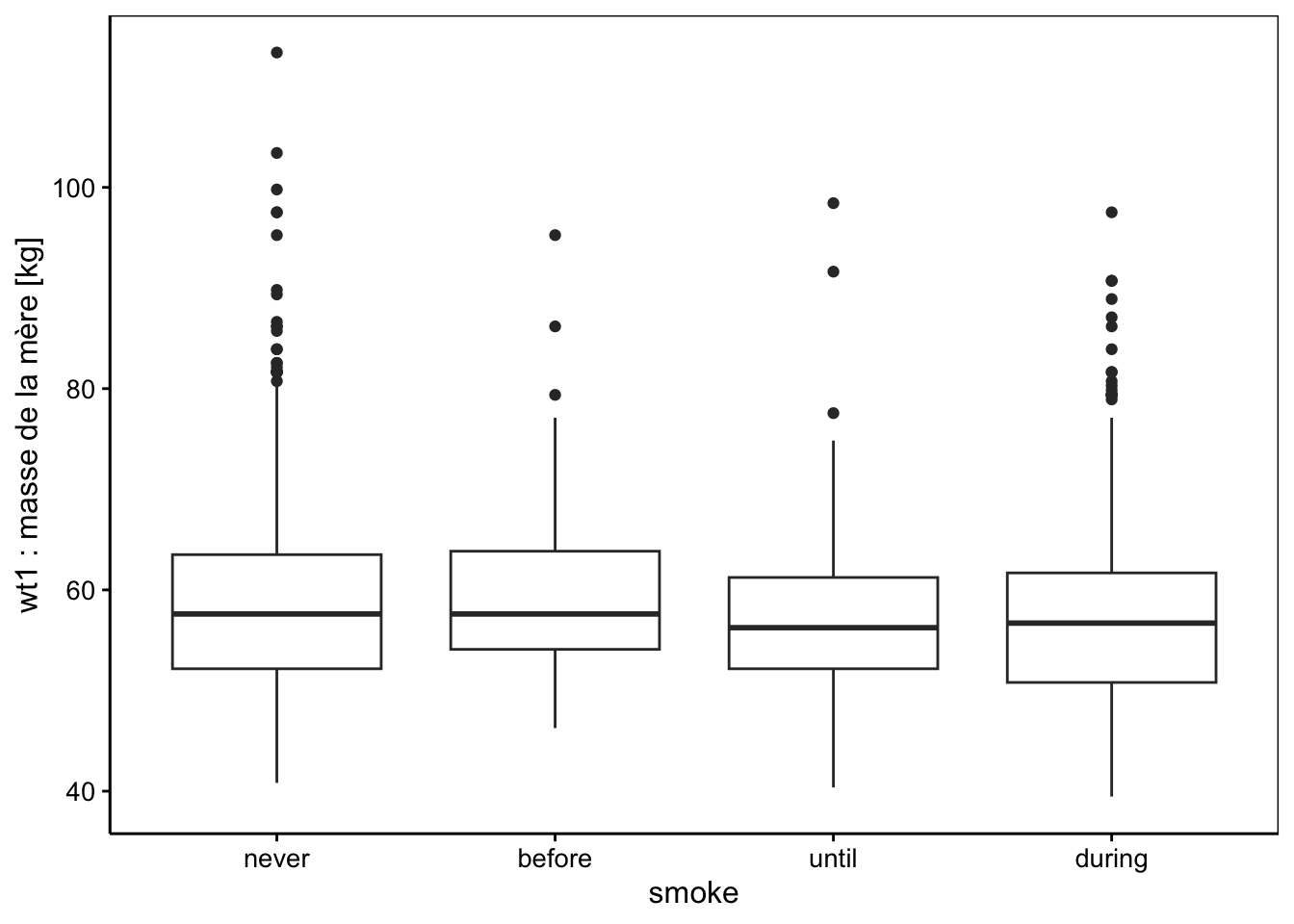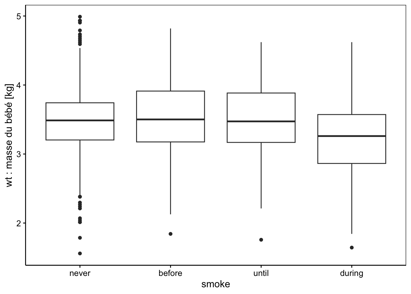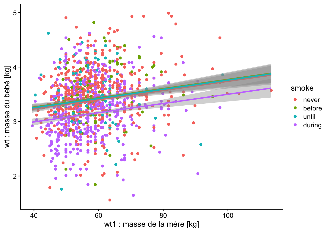 Ici, comme nous testons tous les contrastes, nous pouvons dire que la population des mères qui ont fumé pendant la grossesse smoke == "during" donne des bébés significativement moins gros au seuil \(\alpha\) de 5%, et ce, en comparaison de tous les autres niveaux (mère n’ayant jamais fumé, ou ayant fumé, mais arrêté avant la grossesse, que ce soit longtemps avant ou juste avant). Globalement, le modèle sans interactions donne ici des résultats bien plus clairs que le modèle avec interactions.