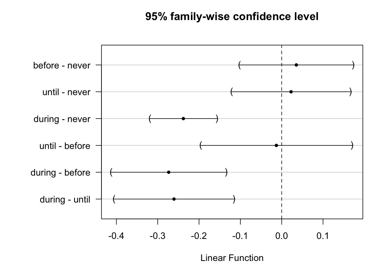 # during - never == 0 -0.23794 0.03182 -7.478 <1e-04 ***