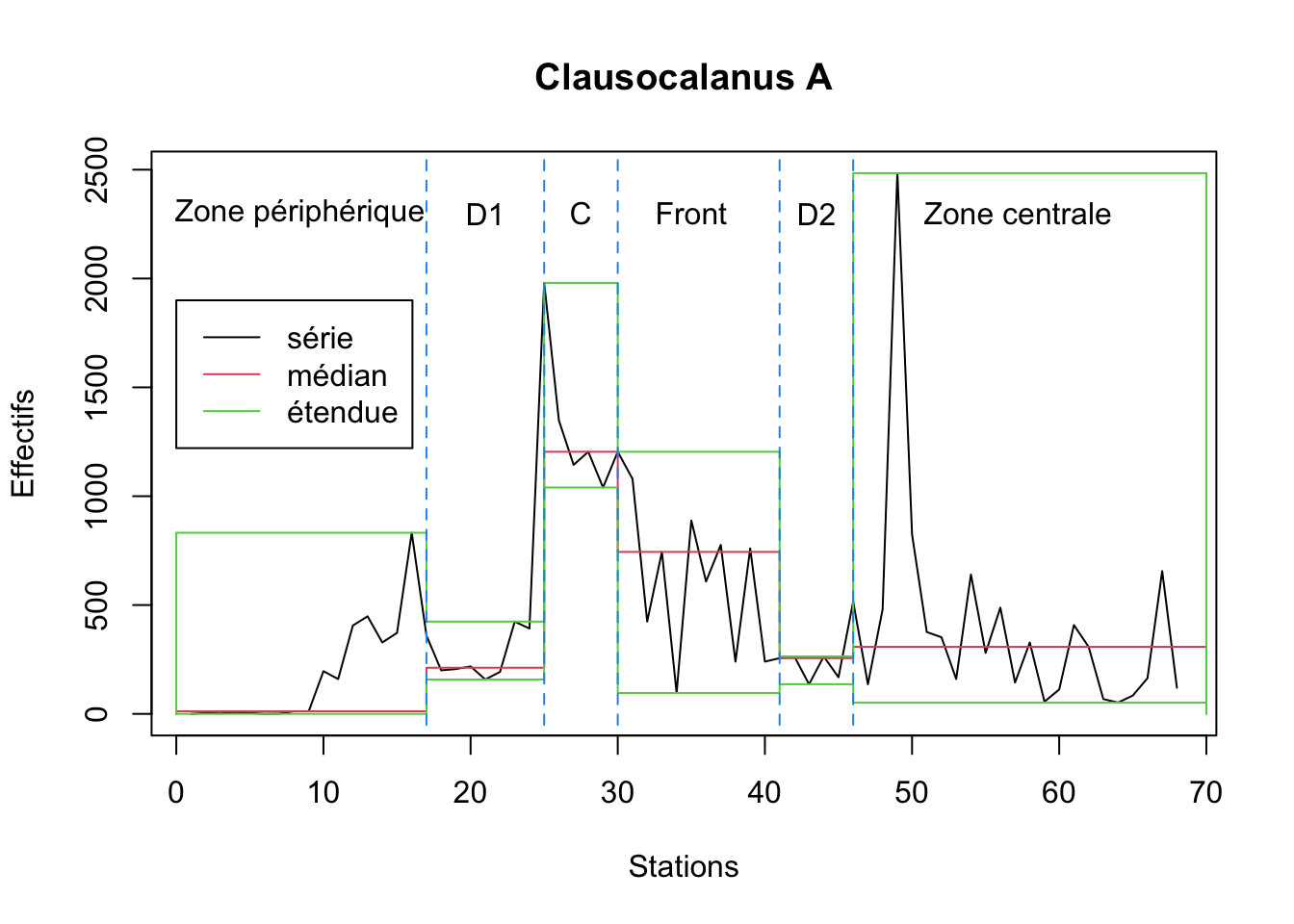 Toujours pour la même série, nous pouvons calculer toutes les statistiques sur des intervalles irréguliers, puis représenter l’étendue (minimum, maximum) et la médiane pour chaque intervalle comme suit (ces intervalles correspondent aux différentes masses d’eaux croisées le long du transect) :