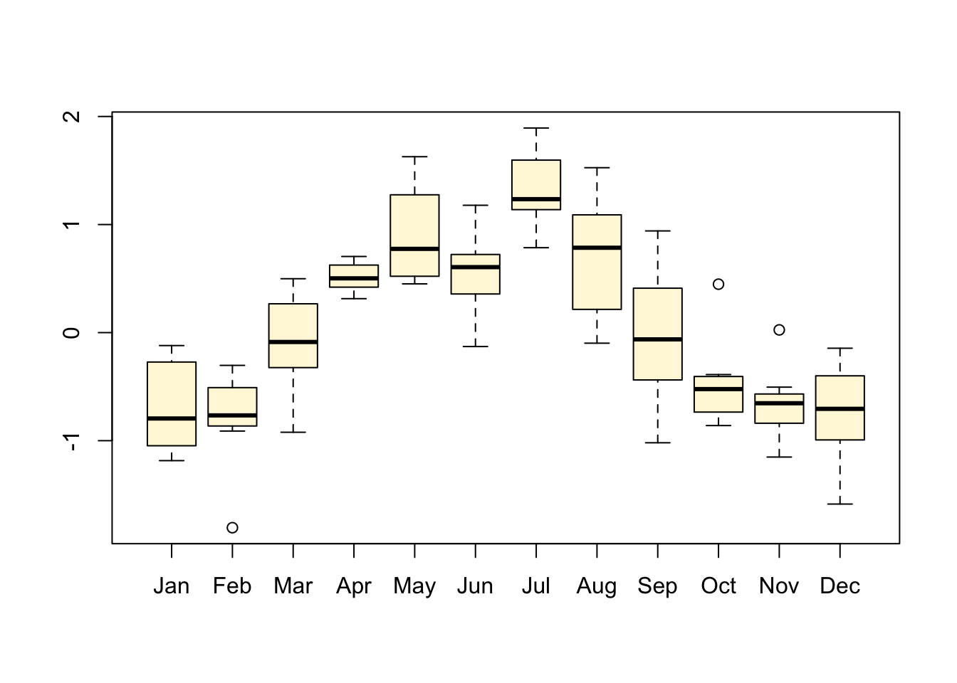 Nous avons déjà vu la fonction time() qui permet de reconstituer le vecteur temps pour la série. La fonction cycle() indique l’appartenance de chaque donnée de la série à un cycle. Elle permet, par exemple, de séparer les données par mois si la base de temps est l’année à l’aide de la fonction split(). Ensuite, il est possible de traiter ou de représenter séparément les statistiques mois par mois pour en faire, par exemple, des boites à moustaches parallèles :